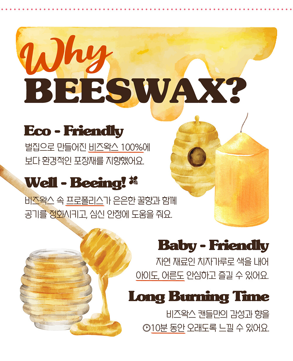 비즈왁스 속 프로폴리스가 달큰하고 산뜻한 꿀향과 함께 공기를 정화시켜 준답니다.