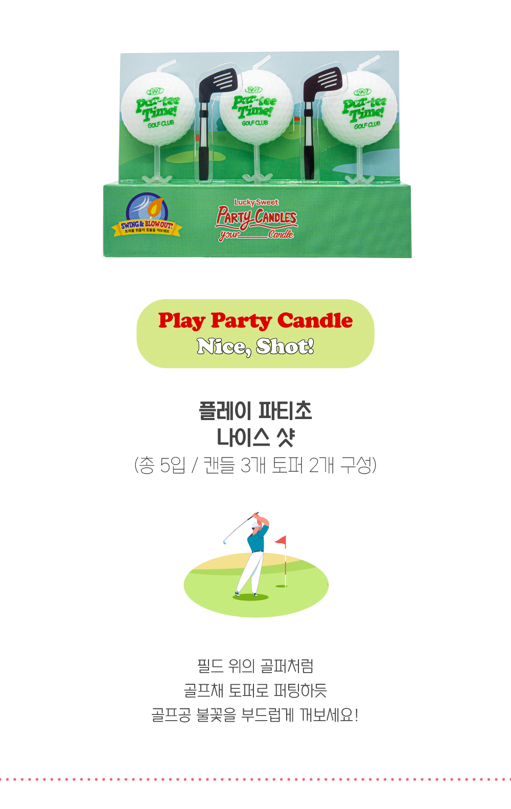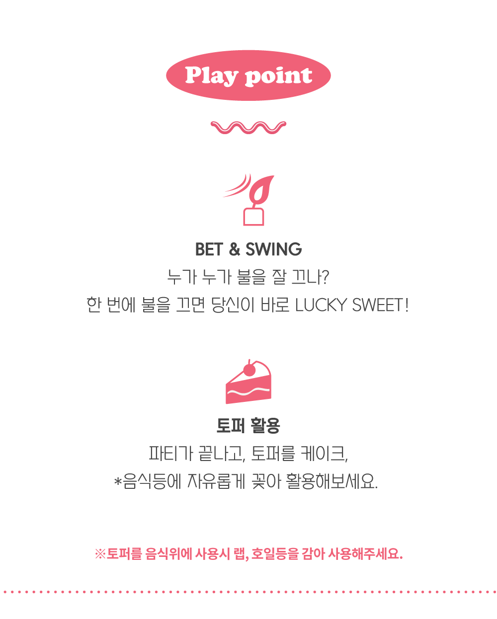 케이크 위에서 나만의 개성과 특별함을 표현할 수 있는 파티초입니다. 이 제품은 단순히 불을 끄는 생일초가 아니라, 토퍼와 결합된 특별한 파티 아이템 으로 “즐거움”이라는 코드에 맞춰 디자인되었습니다. 불을 끄는 행위(play) 자체가 하나의 이벤트가 되어, 특별한 날 예상치 못한 즐거움과 웃음을 선사합니다. 소중한 순간을 더 특별하게 만들어 줄 색다른 파티초(생일초) 를 경험해 보세요.