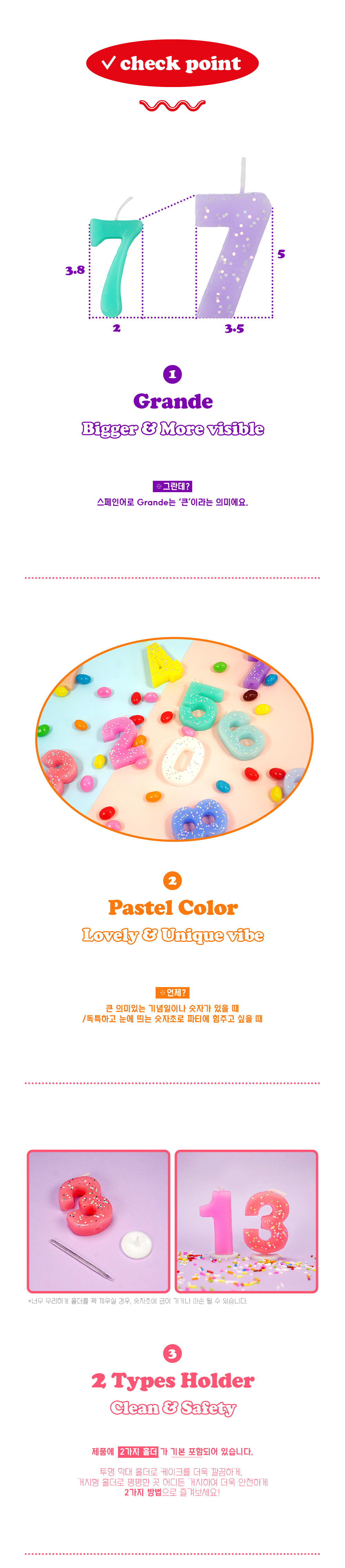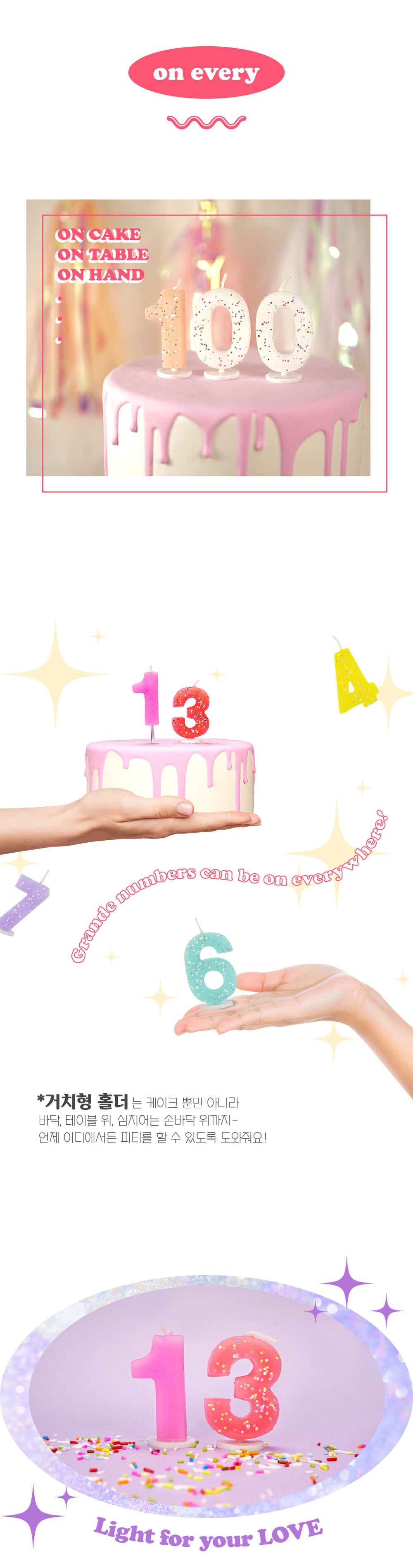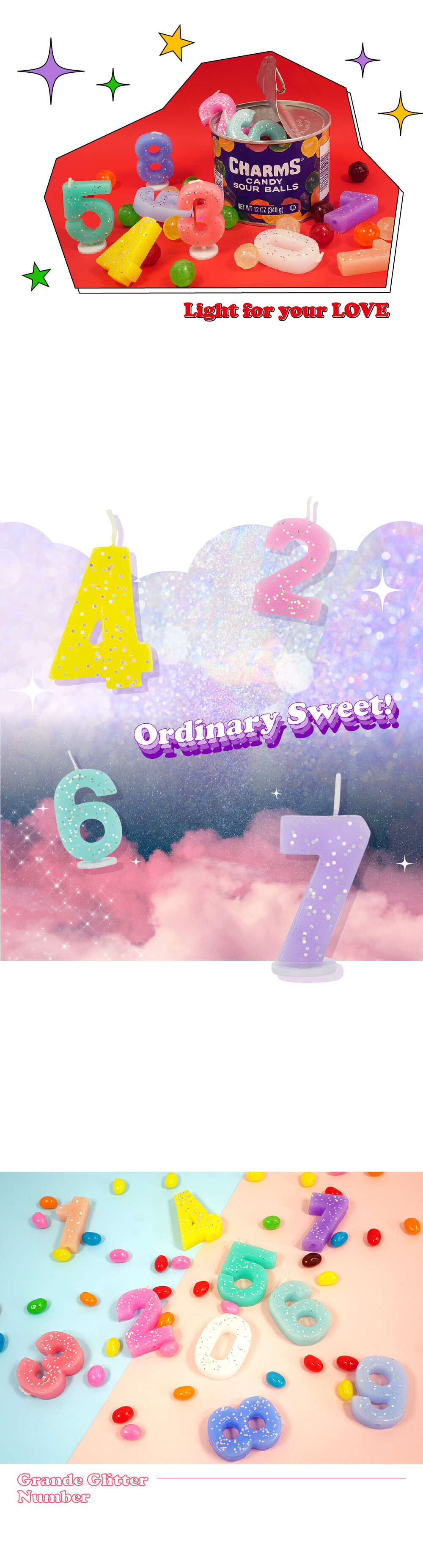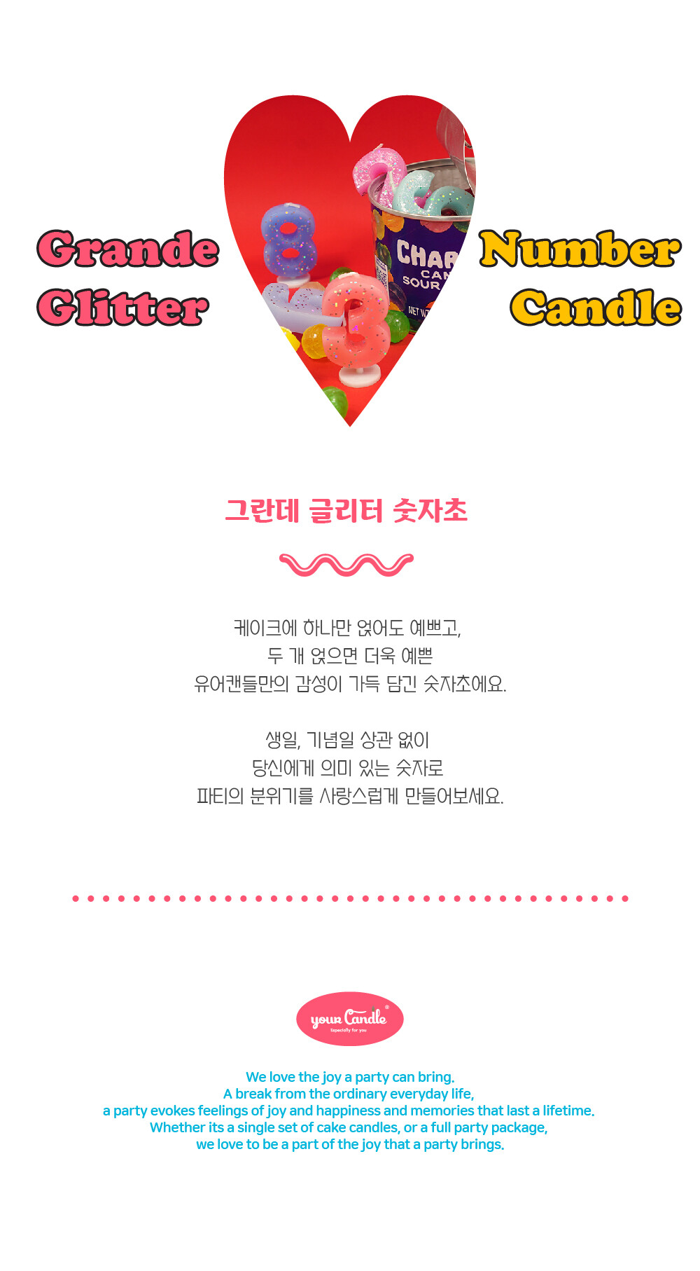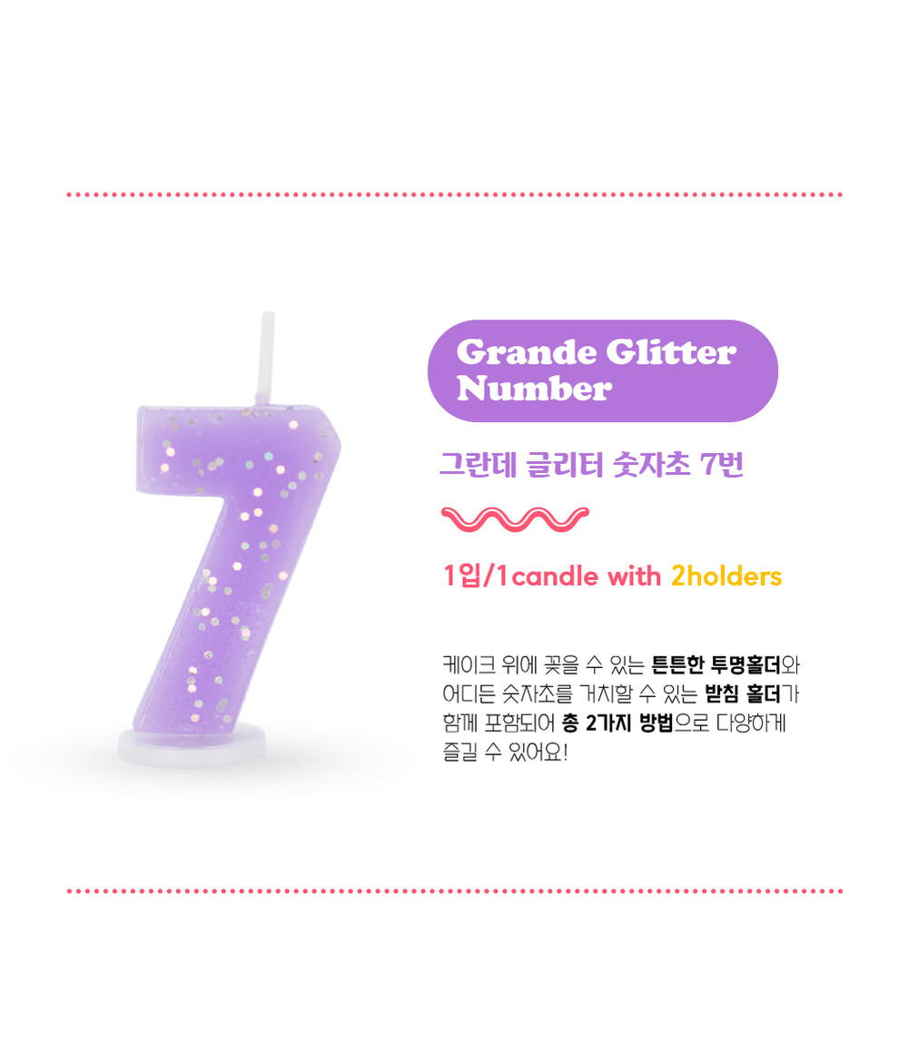 인기 숫자초 '그란데 오리지널 숫자초'에 이어 더욱 화려하고 예쁜 '그란데 글리터 숫자초'가 출시되었습니다! 보다 빛나게, 보다 사랑스럽게 케이크 위를 꾸며 보아요!