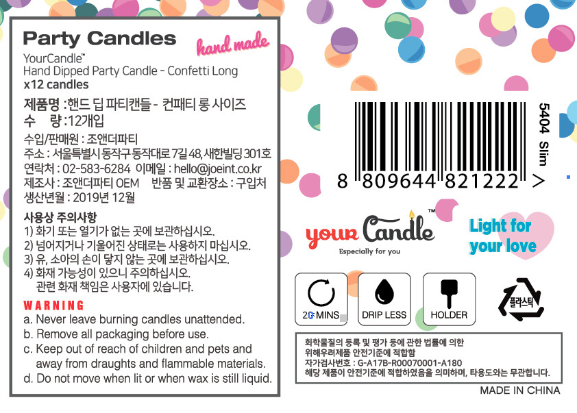 도매) 핸드딥 컨페티 파티캔들 - 롱 사이즈