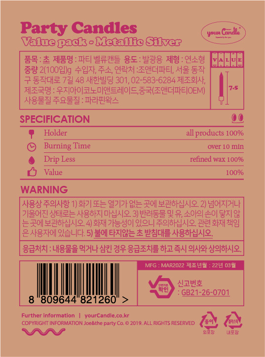 유어캔들 벨류팩 - 메탈릭 실버 파티캔들