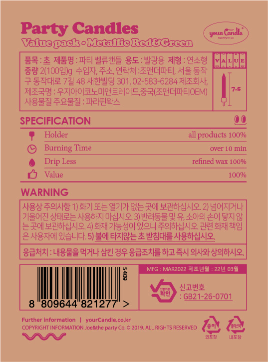 벨류팩선택하세요.메탈릭 레드&그린 파티캔들 (품절)